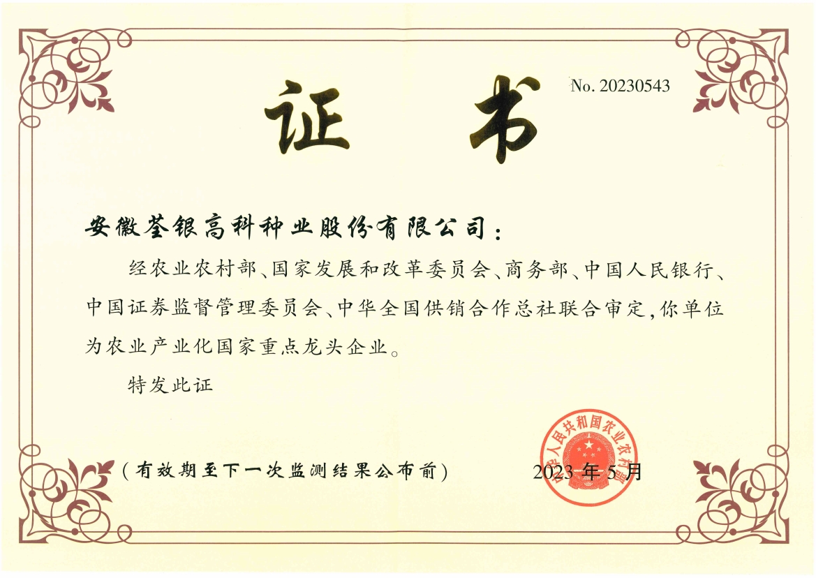 安徽荃銀高科種業(yè)股份有限公司是一家“以種業(yè)為核心、農(nóng)業(yè)服務(wù)為延伸、探索和創(chuàng)新農(nóng)業(yè)多元化發(fā)展”的現(xiàn)代高科技種業(yè)上市公司,證券代碼:300087。公司注冊資金9.47億元,系“中國種業(yè)領(lǐng)軍企業(yè)、農(nóng)業(yè)產(chǎn)業(yè)化國家重點龍頭企業(yè)、國家高新技術(shù)企業(yè)、農(nóng)業(yè)部首批農(nóng)作物種子育繁推一體化企業(yè)、中國種業(yè)信用明星企業(yè)"。在國內(nèi)控股子公司20多家,在國外設(shè)立分支機(jī)構(gòu)4家,良種銷售至全國20多個?。ㄊ小^(qū)),出口覆蓋20多個國家與地區(qū),種業(yè)綜合實力、雜交水稻研發(fā)、推廣及海外業(yè)務(wù)規(guī)模均居全國種子企業(yè)前2位。
